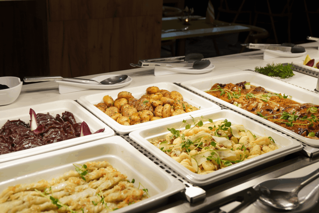 Das Buffet bietet sowohl warme als auch kalte Speisen an. Auch warmes, frisches Brot und Kindergerichte warten immer auf Sie. Auf dem Buffet gibt es etwas Süßes, das von unseren Konditoren gebacken werden, sowie leckeren Kaffee, Tee und kalte Getränke.